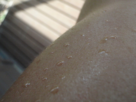 Tシャツの胸元や袖口からダラダラと汗を流し
