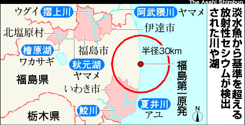淡水魚から基準を超える放射性セシウムが検出された川や湖