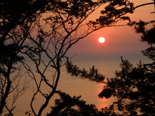 樹木の間から夕陽を撮ると