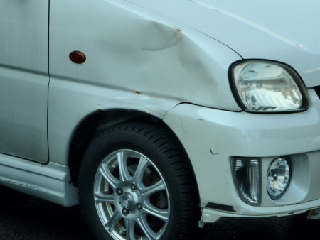 近くの軽自動車がすごく凹んでた
