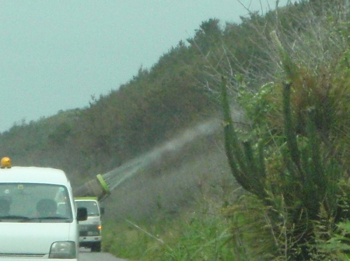 後方のトラックから害虫駆除薬を噴霧しているようだ