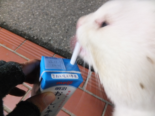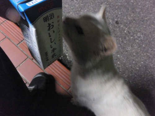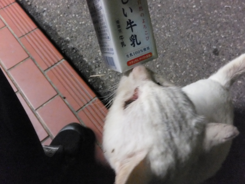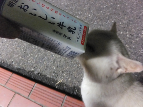 さあさあ、牛乳を飲みなさい。 かわいそうな弱猫シロクン。