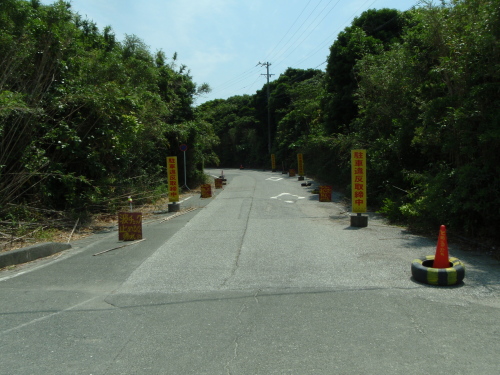 駐車違反取締中の立て看板がいっぱい並んでる