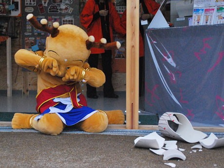 同祭マスコットキャラクターの「せ〇とくん」をハプニングが襲った。(奈〇経済新聞)
