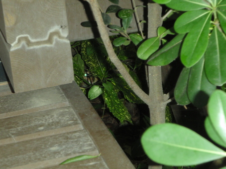 海の家側面の植え込みに飛び込んでいった